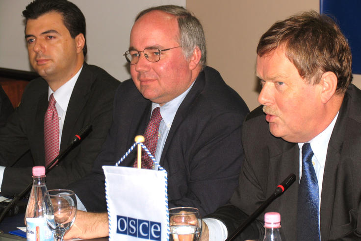 Head of Presence, Ambassador Robert Bosch (r), presents three OSCE publications on policing together with Albanian Interior Minister Lulzim Basha (l) and Head of the Presence's Rule of Law Department Frank Dalton, Tirana, 28 October 2009.