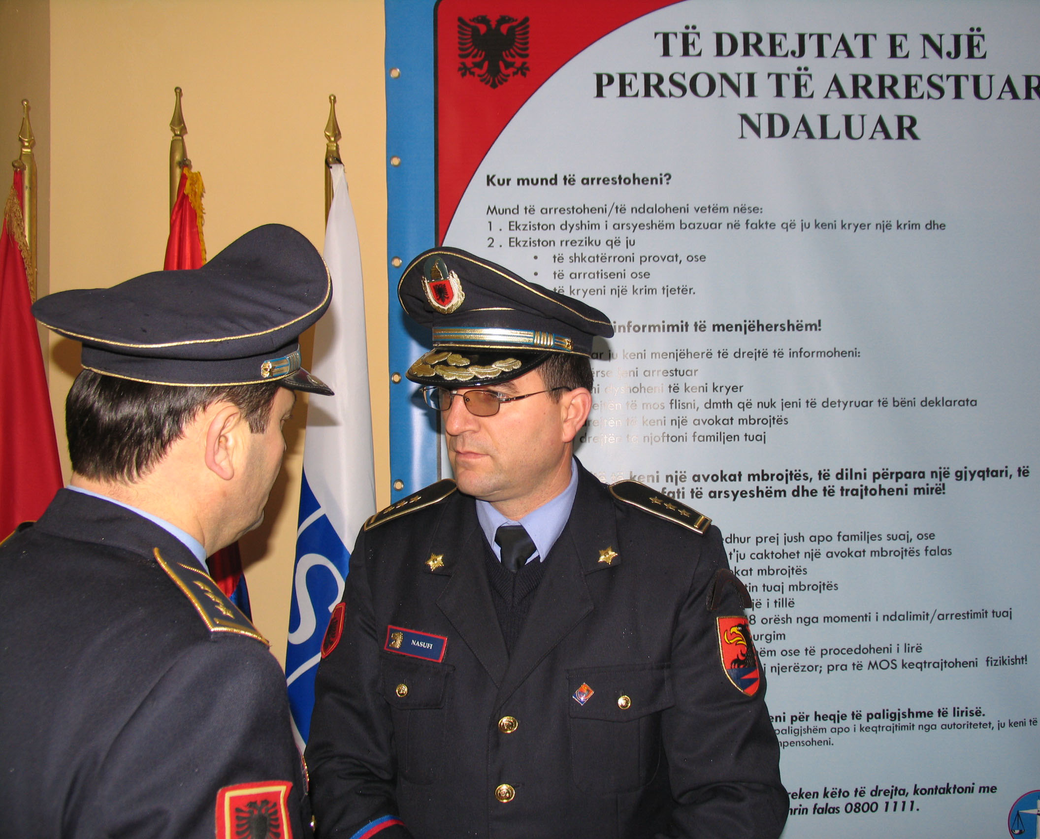 Two police officers talk in front of an information board showing the rights of detained people, Tirana, 8 March 2010. The OSCE Presence in Albania has provided all police stations across the country with similar boards.