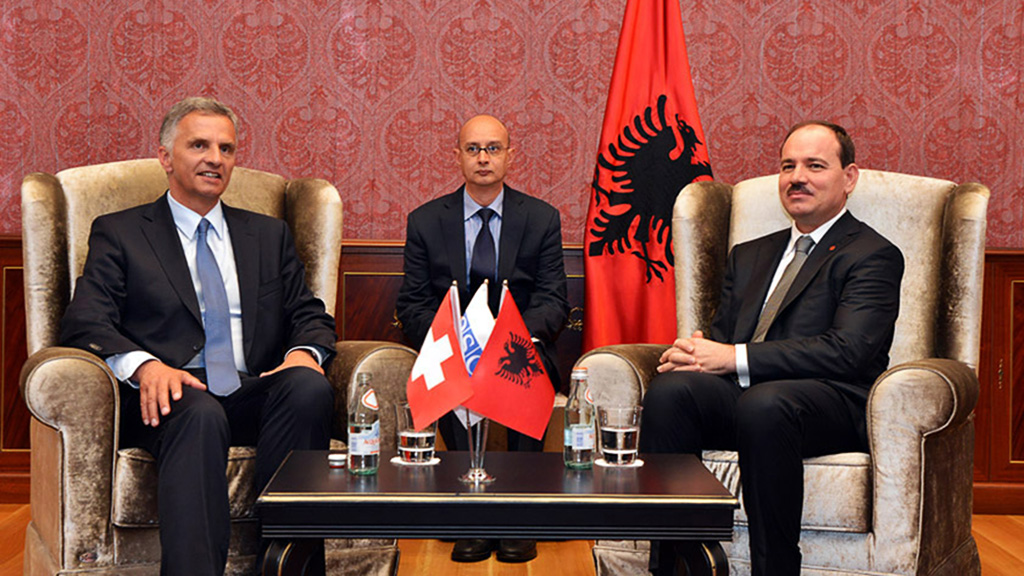 OSCE Chairperson-in-Office and Swiss Foreign Minister Didier Burkhalter (l) with Albania’s President Bujar Nishani during a visit to Albania, Tirana, 24 April 2014.