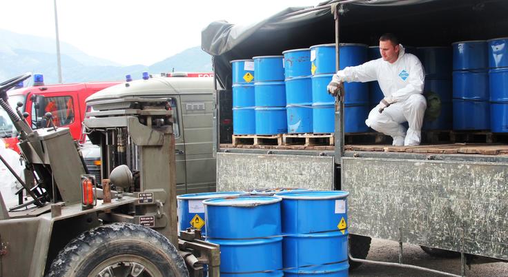 Hazardous chemicals being loaded in trucks to be shipped for safe destruction out of Albania, as part of a project run by the OSCE Presence in Albania, Tirana, 27 May 2015.