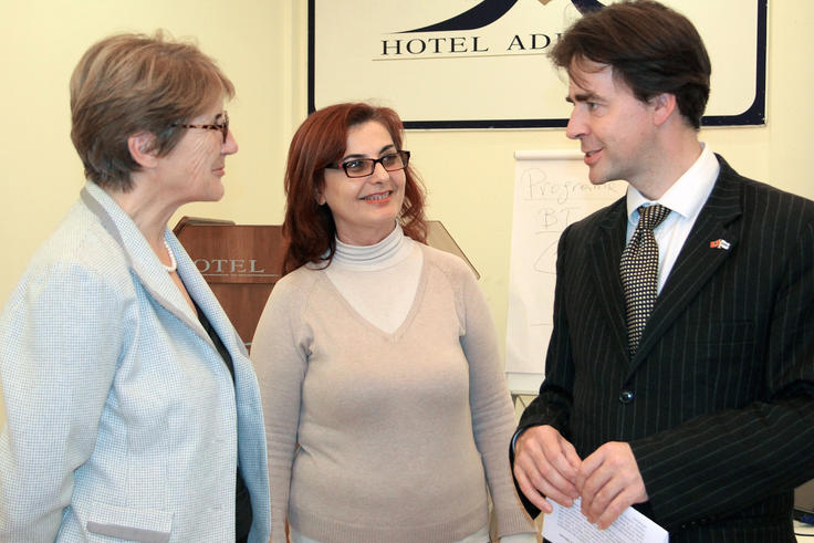 Deputy Head of the OSCE Presence in Albania Robert Wilton (r) talks with Albanian local officials participating at OSCE-organized School for Municipal Women Councillors, Durrës, Albania, 24 November 2015.