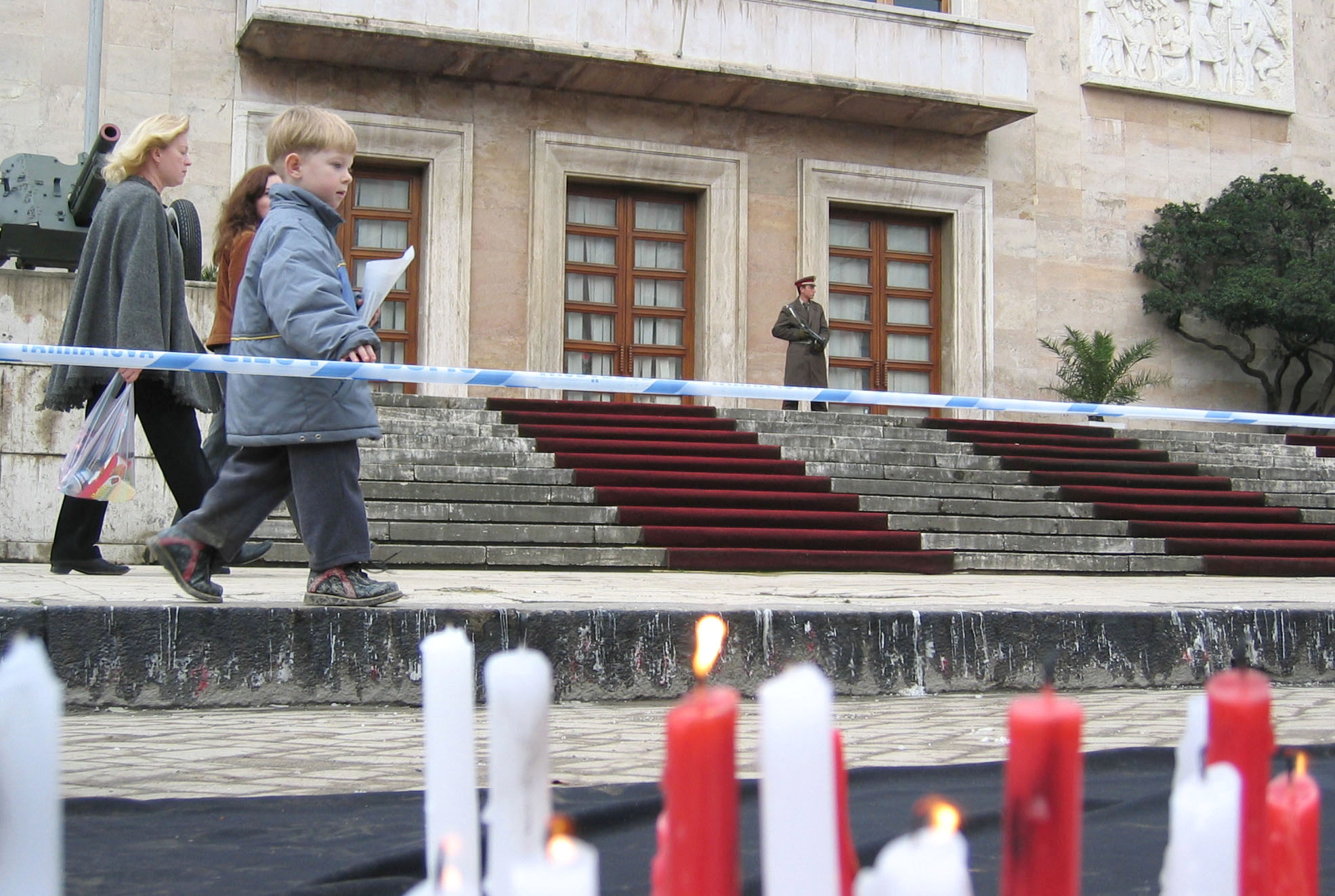 People pay tribute in front of the Prime Minister's Office in Tirana to the victims of the 9 January tragedy, when at least 21 people died off the southern Albanian coast while trying to emigrate to Italy, 14 January 2004.