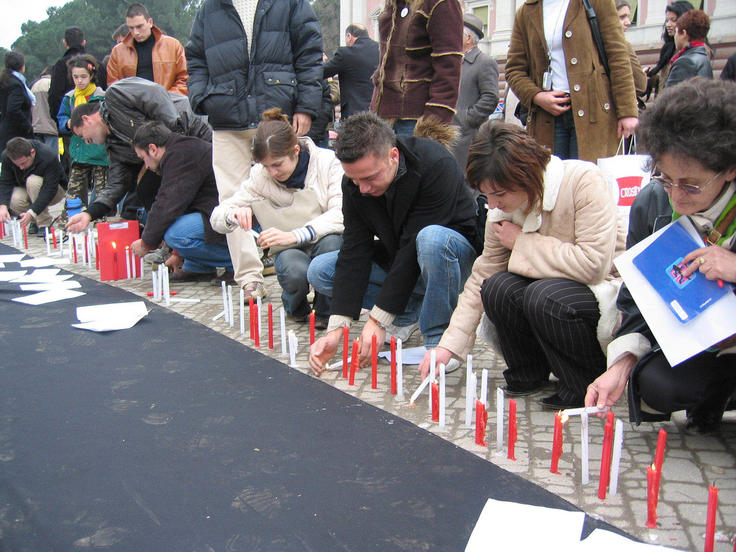People pay tribute in front of the Prime Minister's Office in Tirana to the victims of the 9 January tragedy, when at least 21 people died off the southern Albanian coast while trying to emigrate to Italy illegally, 14 January 2004.