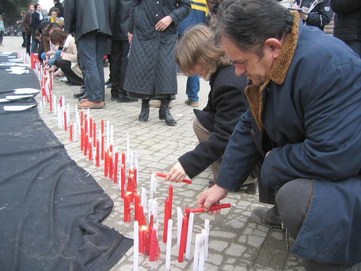 People pay tribute in front of the Prime Minister's Office in Tirana to the victims of the 9 January tragedy, when at least 21 people died off the southern Albanian coast while trying to emigrate to Italy, 14 January 2004.