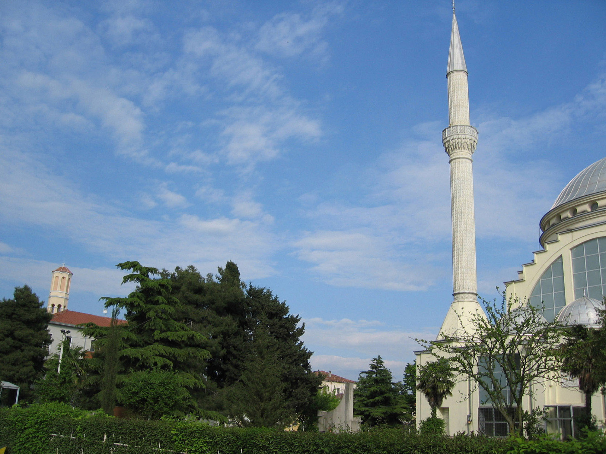 A mosque and a church side by side in Shkodra provide an illustration of religious tolerance in Albania, April 2004.