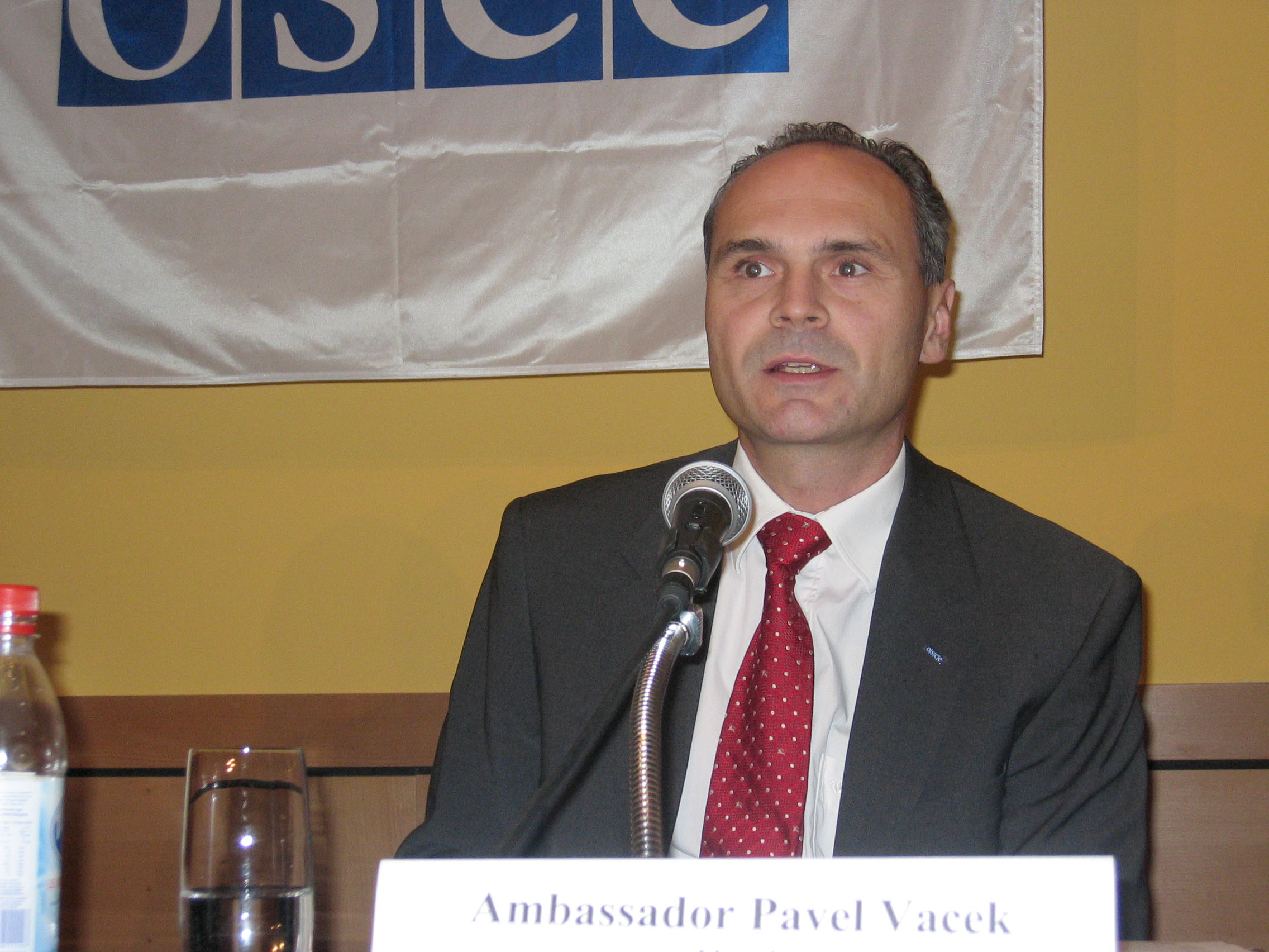 Ambassador Pavel Vacek presents his priorities to the Albanian media at his first press conference as Head of the OSCE Presence in Albania, Tirana, 5 November 2004.