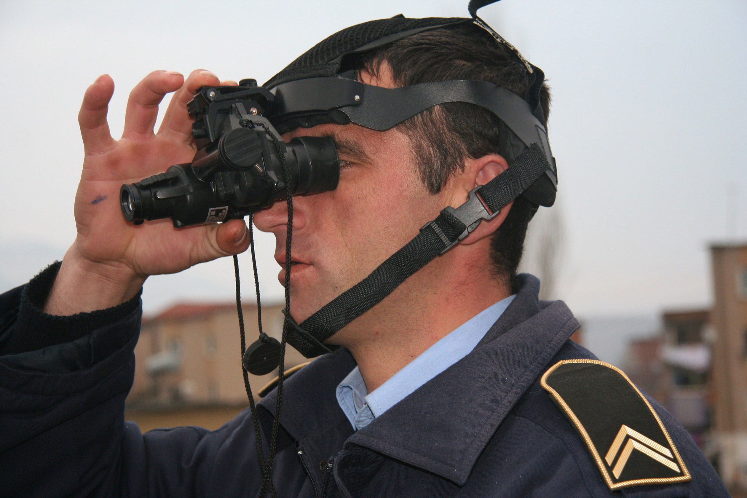 An Albanian policeman tests new border surveillance equipment, March 2006. Over 100 policemen received two months of training in the use of the equipment with support from the OSCE Presence in Albania and the OSCE Mission to Georgia.