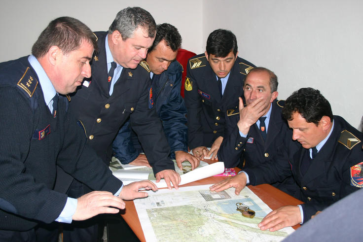 Albanian border and migration police discuss during a course on map reading, part of a training workshop organized by the OSCE Presence in Albania, Lezha, April 2006.
