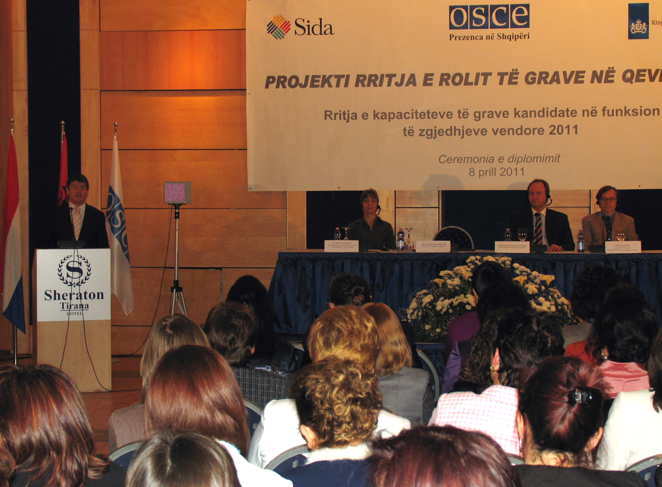 Albanian President Bamir Topi addresses women who completed a training project of the OSCE Presence for female candidates in the 2011 local government elections, Tirana, 8 April 2011.