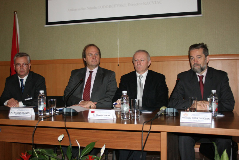 R-l: The Director of the Regional Arms Control Verification and Implementation Assistance Centre (RACVIAC), Ambassador Todorčevski, Albanian Deputy Minister of Defence Starova, The Head of the OSCE Presence in Albania, Ambassador Eugen Wollfarth, and RACVIAC Programme Manager Col. Stefan Miene, during an international arms control symposium, Tirana, 22 November 2011.