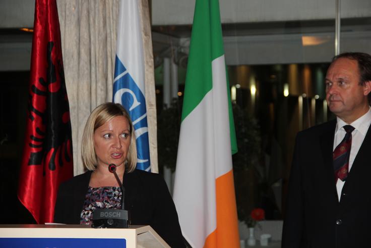 The Representative of the Irish Chairperson-in-Office of the OSCE, Minister for European Affairs Lucinda Creighton, addresses participants at an event during her official visit to Albania, alongside the Head of the OSCE Presence in Albania Ambassador Eugen Wollfarth, Tirana, 28 September 2012.