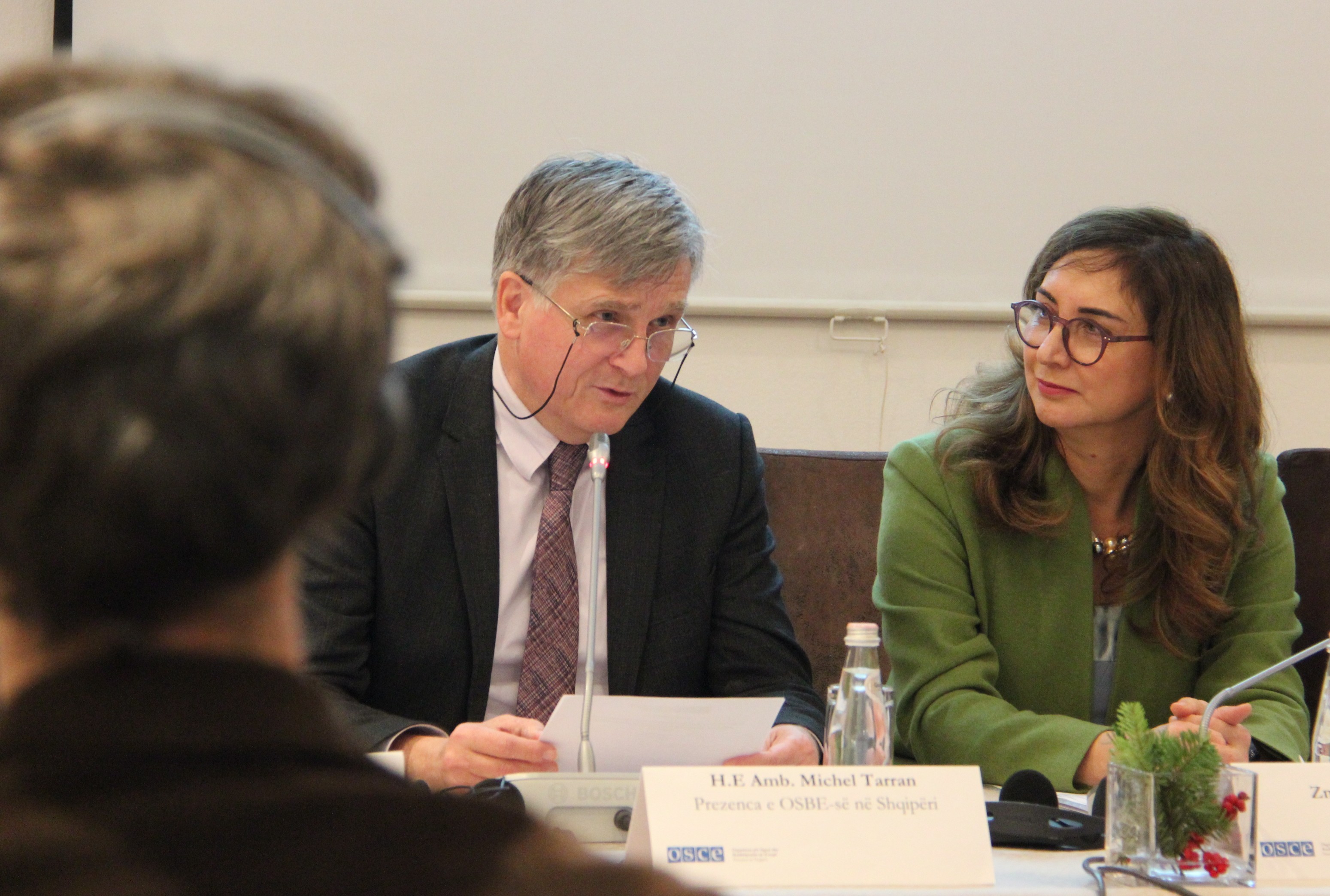 Head of the OSCE Presence in Albania Ambassador Michel Tarran (l) addresses the presentation of assessment on elderly people rights in Albania, alongside People's Advocate Erinda Ballanca, Tirana, 16 December 2025.