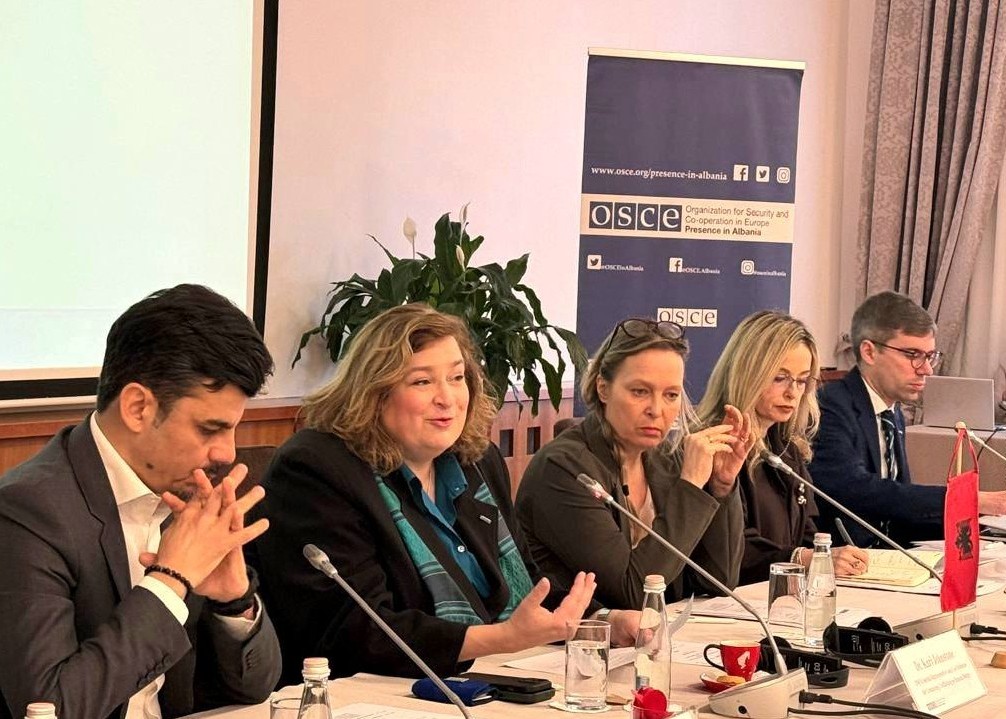 The OSCE Special Representative and Co-ordinator for Combating Trafficking in Human Beings, Kari Johnstone, speaks at a roundtable on strengthening Albania’s response to labour exploitation trafficking, Tirana, 27 March 2026.
