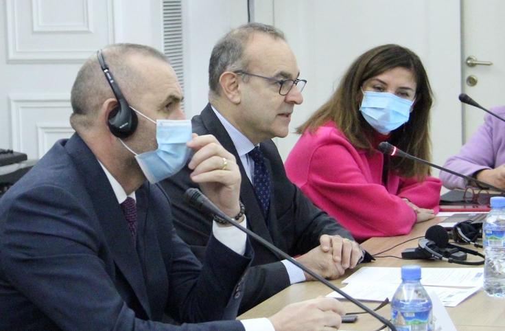 Head of OSCE Presence in Albania Ambassador Vincenzo Del Monaco (c) addresses a special training of prison personnel on human rights compliant management of high-risk prisoners alongside Justice Minister Ulsi Manja (l) and People’s Advocate Erinda Ballanca (r), Tirana, 30 November 2021.