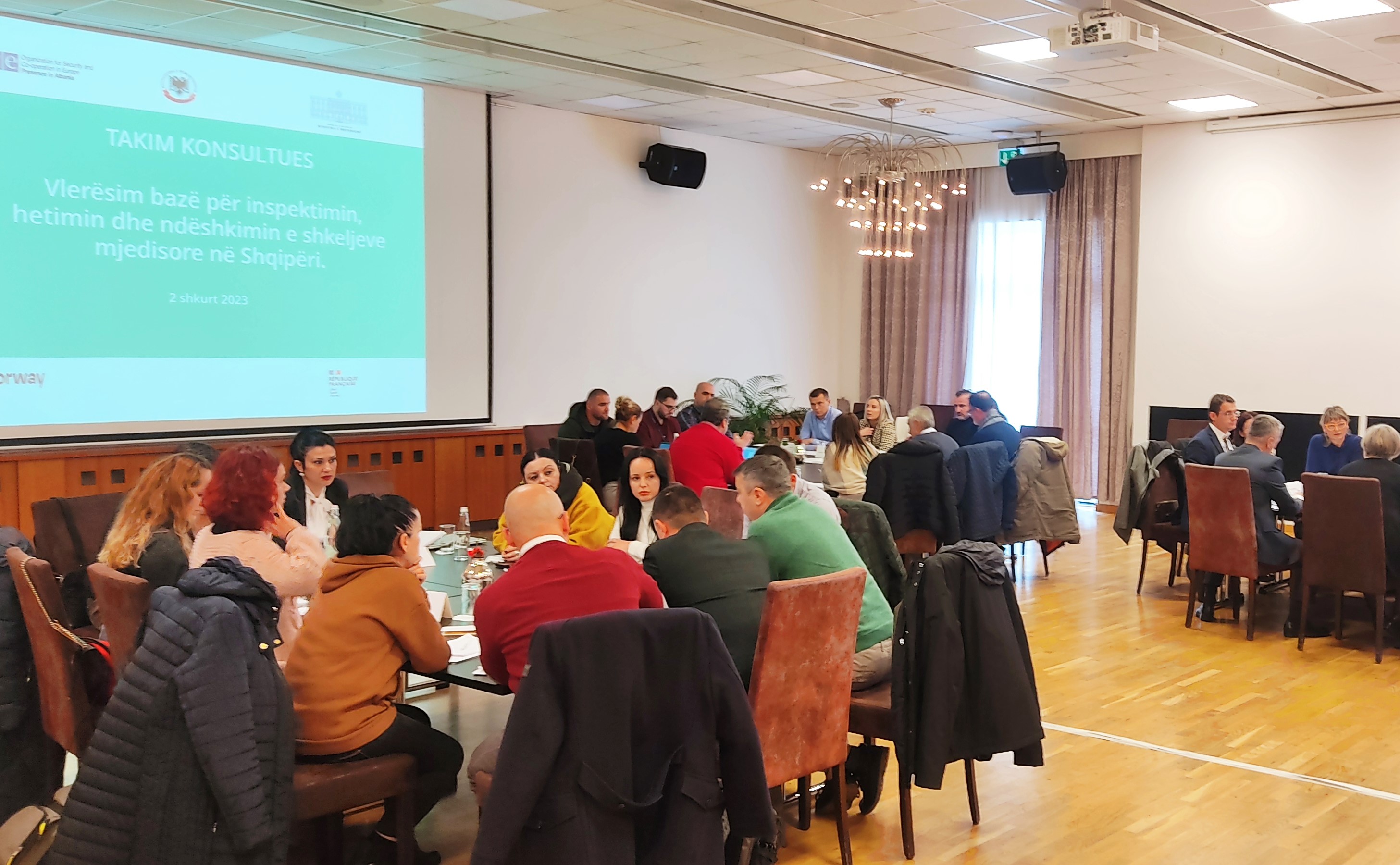Participants discuss findings of a baseline assessment on inspection, investigation and punishment of environmental violations in Albania in workshop organized by OSCE Presence in Albania, 2 February 2023.