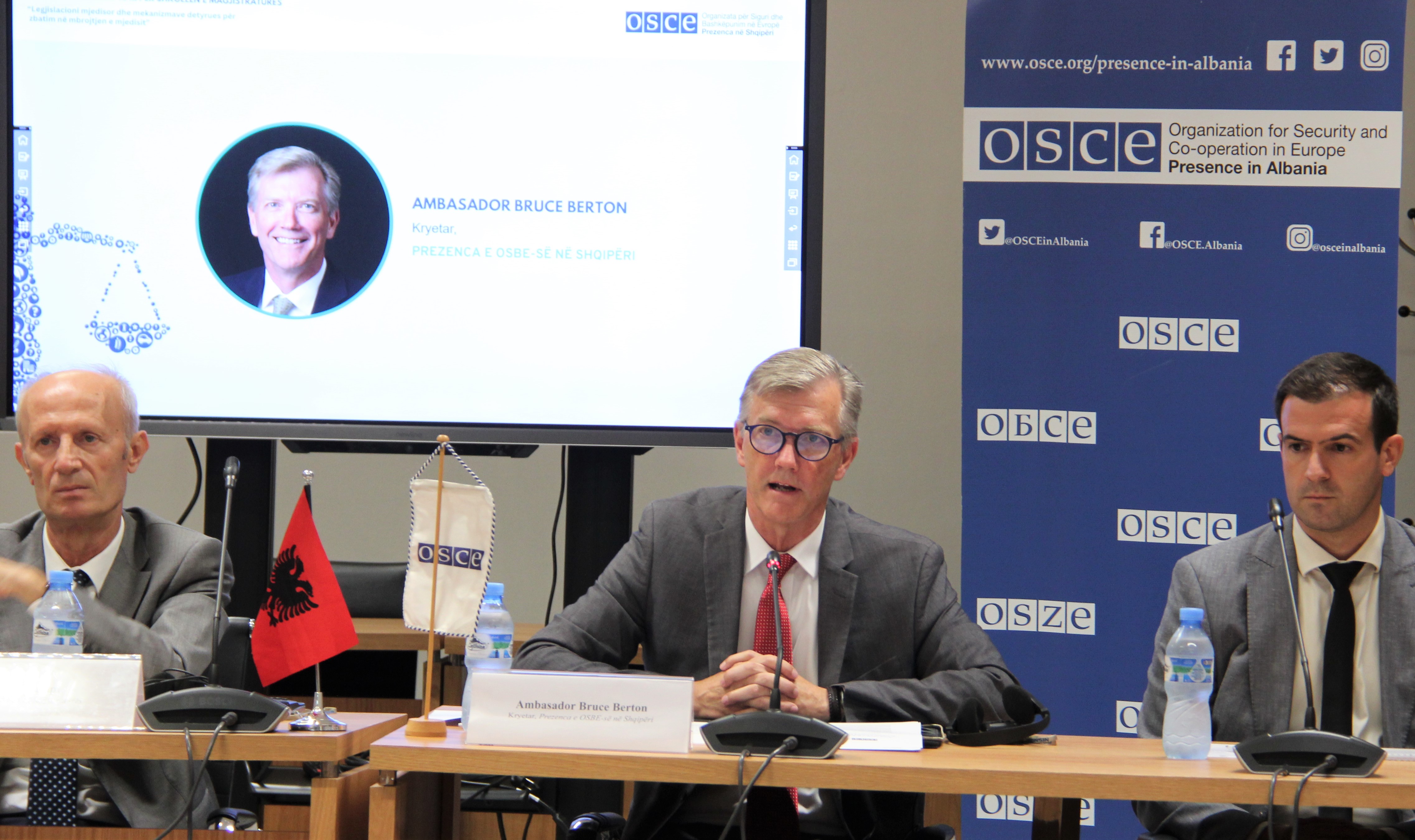 Head of the OSCE Presence in Albania Ambassador Bruce Berton (m) and Director of the School of Magistrates Albert Rakipi (l) launch new course on environmental legislation, Tirana, 25 September 2023.