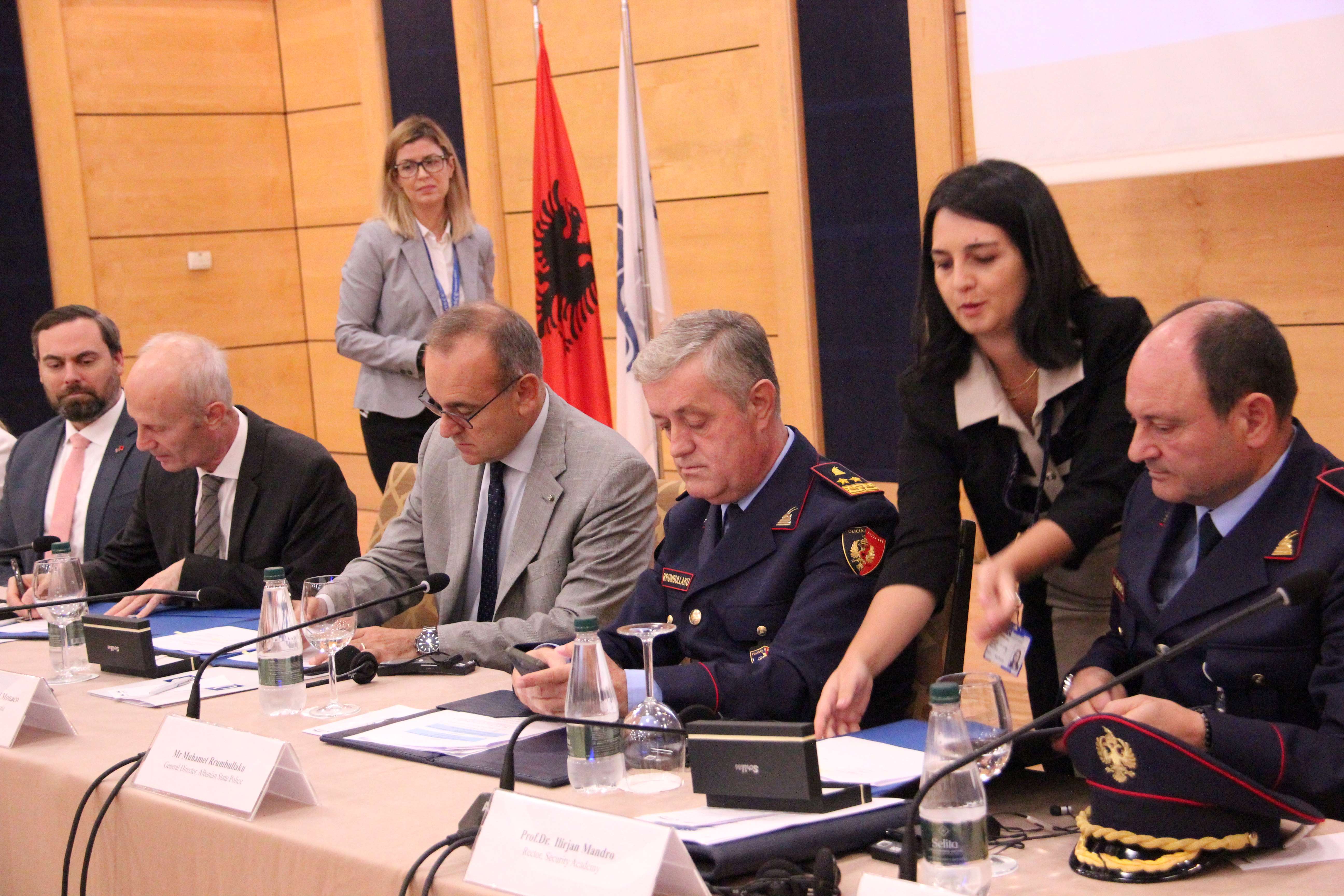 Krerët e Prezencës së OSBE-së në Shqipëri, Shkollës së Magjistraturës dhe Akademisë së Sigurisë nënshkruajnë marrëveshjen për zbatimin e projektit të Prezencës për përmirësimin e kapaciteteve trajnuese në luftën kundër trafikimit të qenieve njerëzore, Tiranë, 12 tetor 2022.
