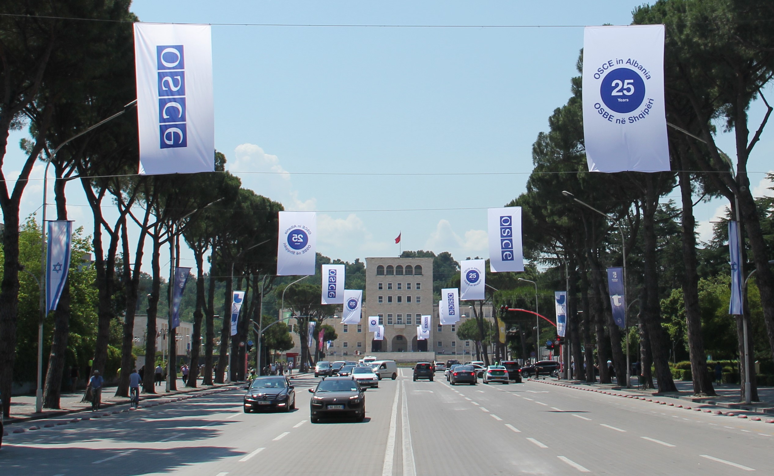 Flamujt e OSBE-së valëviten në bulevardin kryesor të Tiranës, me rastin e 25-vjetorit të Prezencës së OSBE-së në Shqipëri, maj 2022.