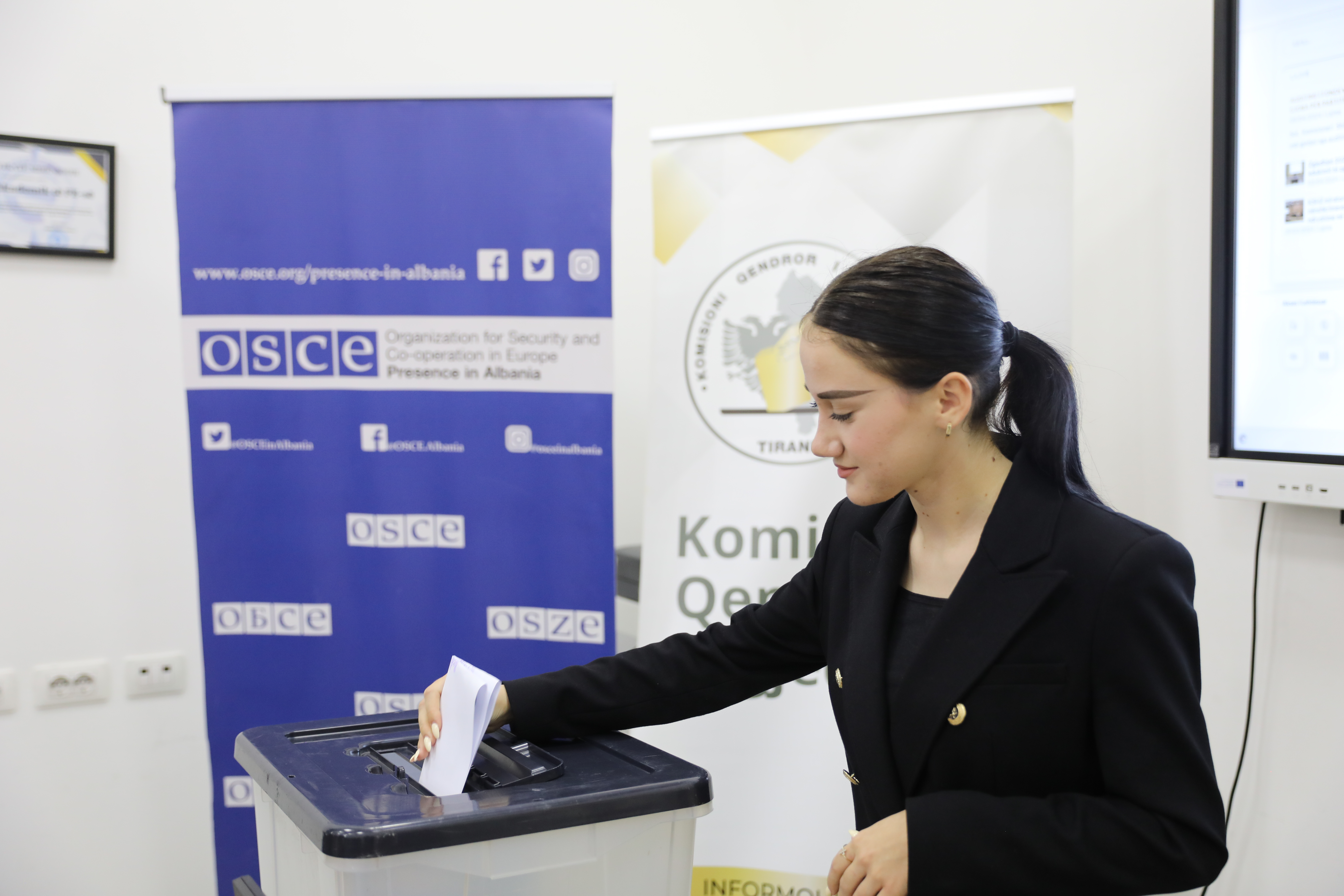 Një studente voton gjatë një simulimi, pjesë e një fushate për edukimin dhe informimin e zgjedhësve mbështetur nga OSBE-ja, Shkodër, 16 maj 2024.