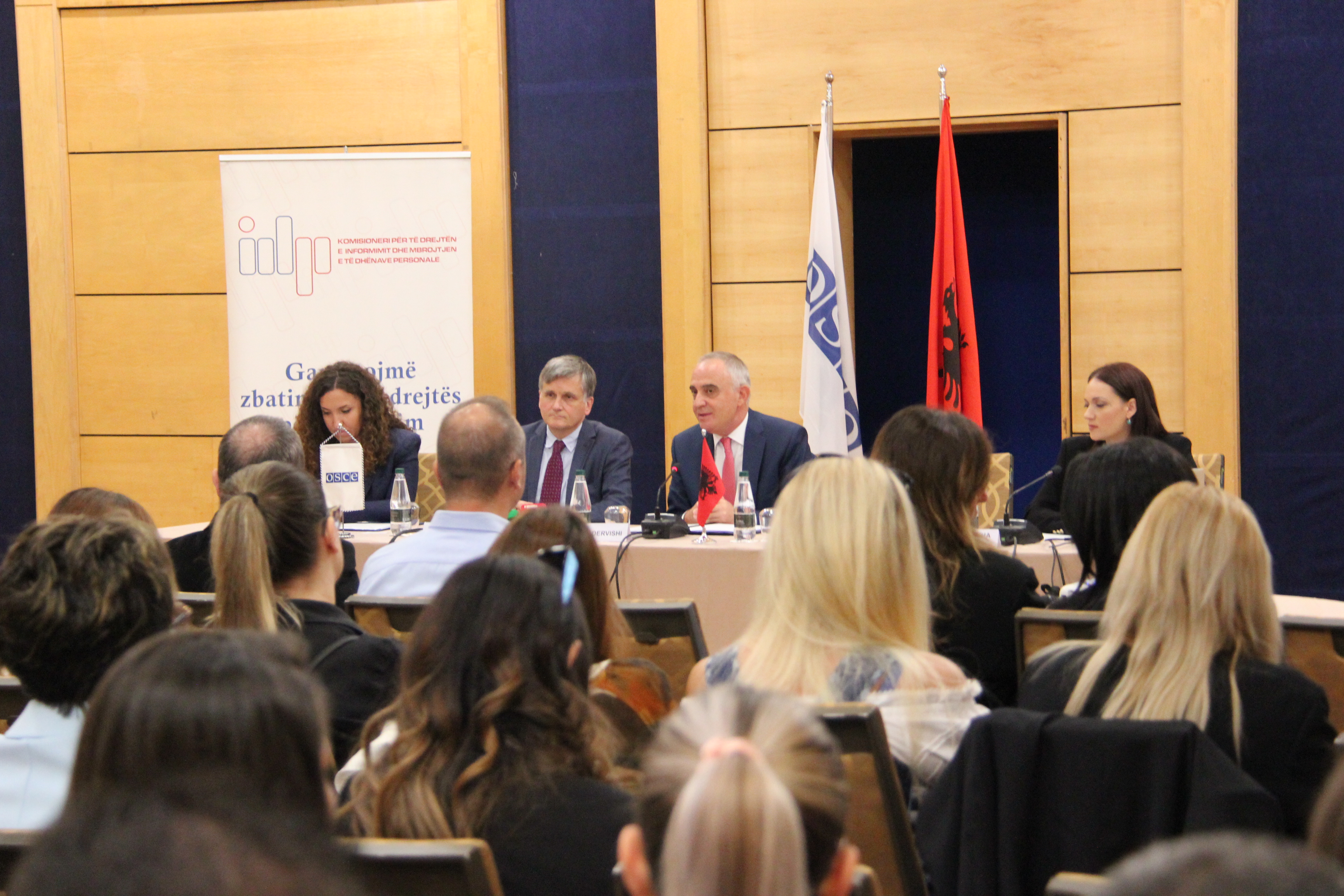 Kryetari i Prezencës së OSBE-së, ambasadori Michel Tarran dhe Komisioneri për Mbrojtjen e të Dhënave, Besnik Dervishi, flasin në veprimtarinë e përbashkët për mbrojtjen e të dhënave në sistemin shëndetësor, Tiranë, 17 shtator 2024.