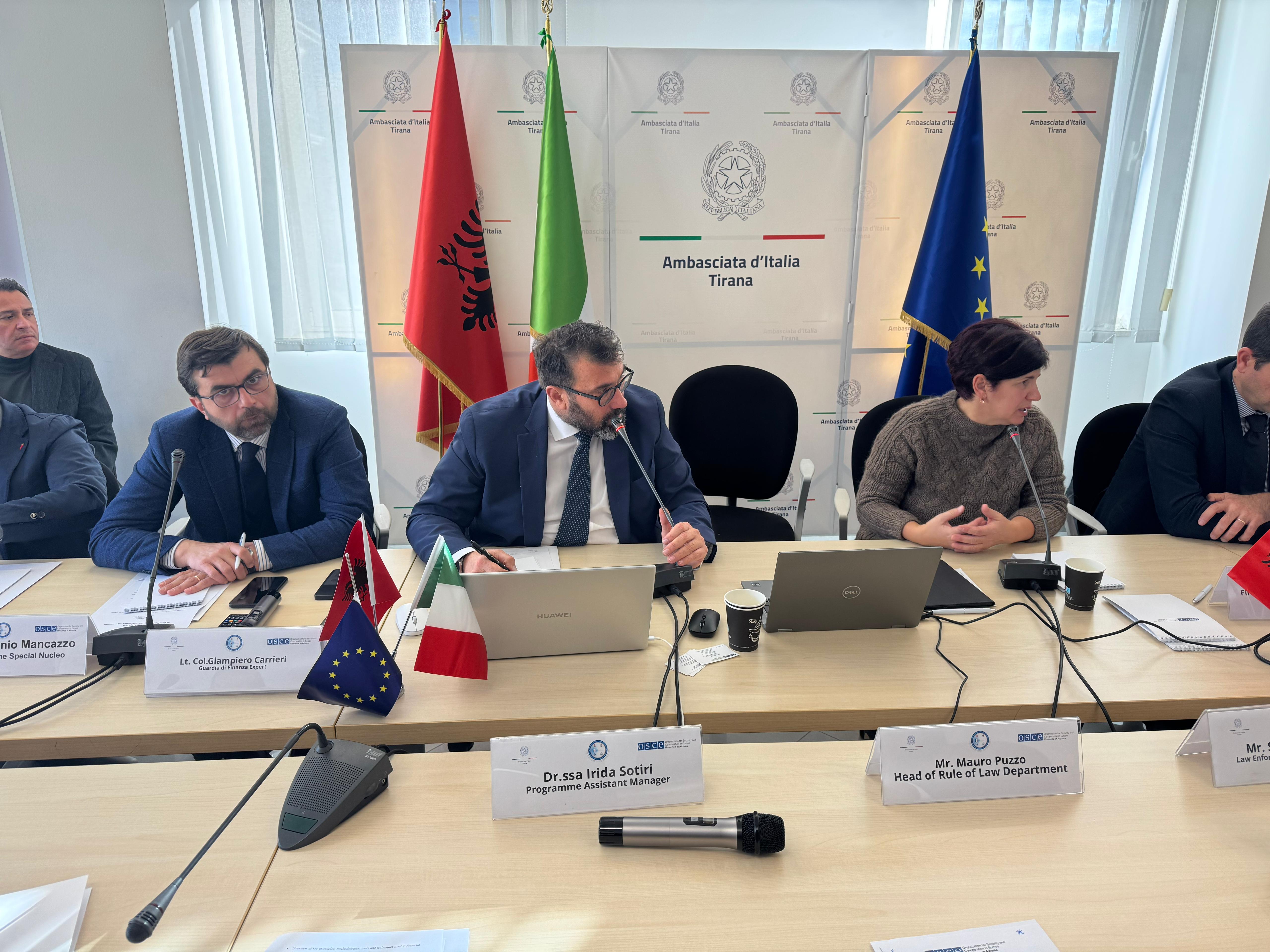 Experts speaking at a peer exchange meeting on cryptocurrency money laundering investigations for Albanian prosecutors and investigators organized by the OSCE Presence in Albania and held at the Italian Embassy in Tirana.