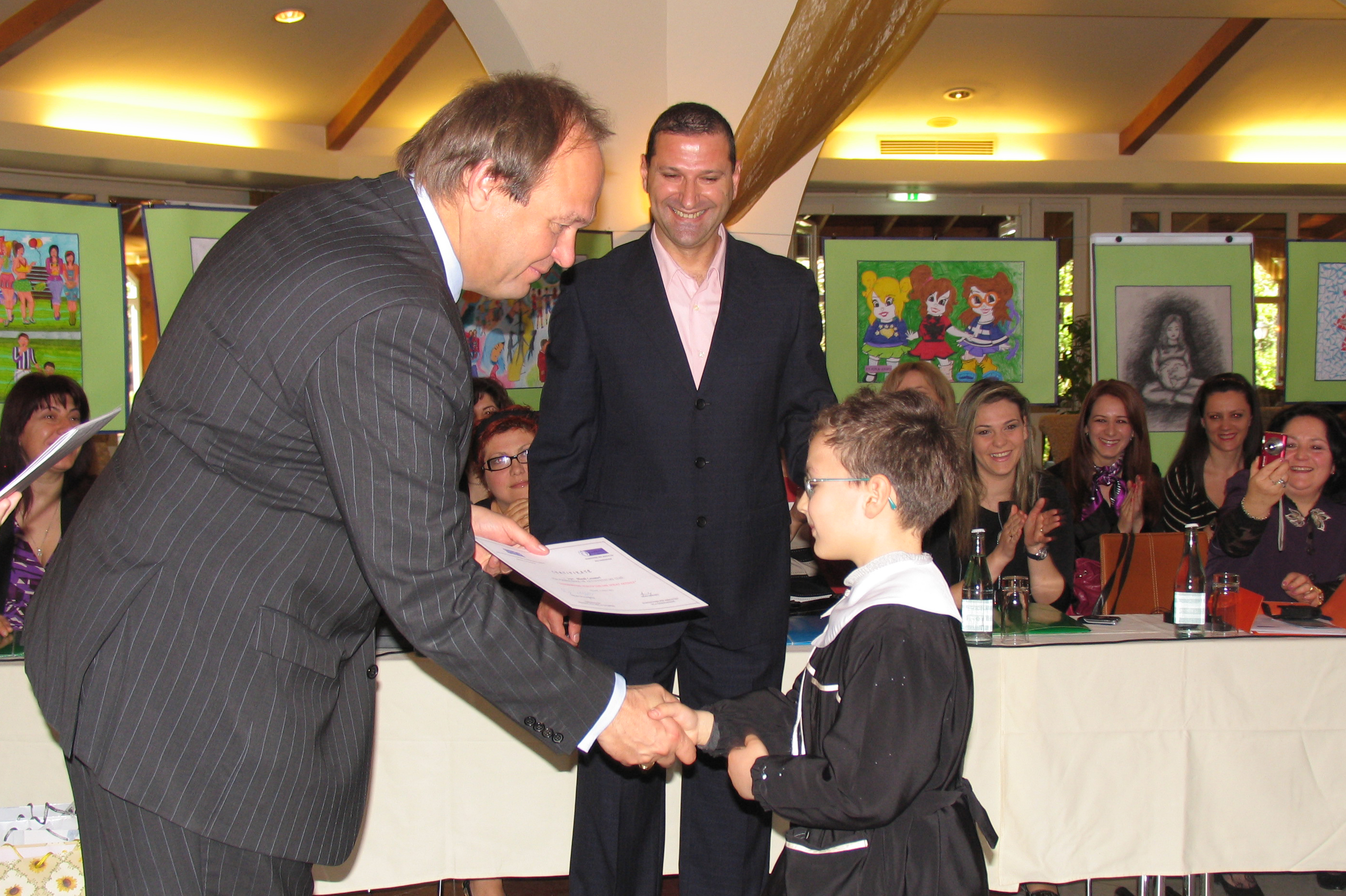 Head of OSCE Presence, Ambassador Eugen Wollfarth, hands certificates to children participating in an anti-discrimination event co-organized with the Commissioner for Protection from Discrimination, Tirana, 11 April 2011.